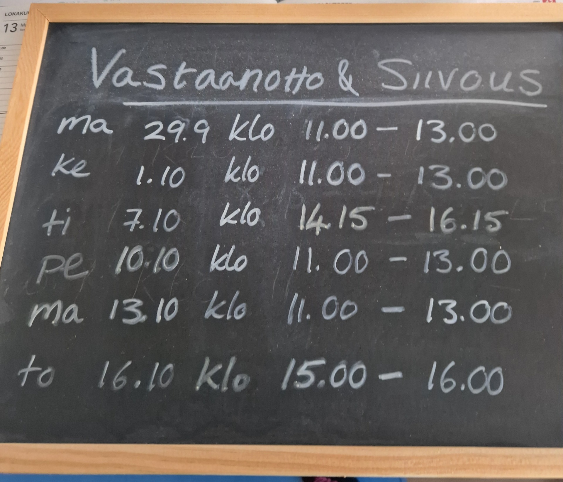Salin vastaanotto on auki pääsääntöisesti kaksikertaa viikossa.Salilla vastaanotto ajat vaihtelevat (yrittäjä tekee vuorotöitä). Mikäli ajantasaiset vastaanottoajat eivät näy viereisessä kuvassa tai tarvitset vastaanottopalveluja muina aikoina laita yrittäjälle viestiä 040 1832322